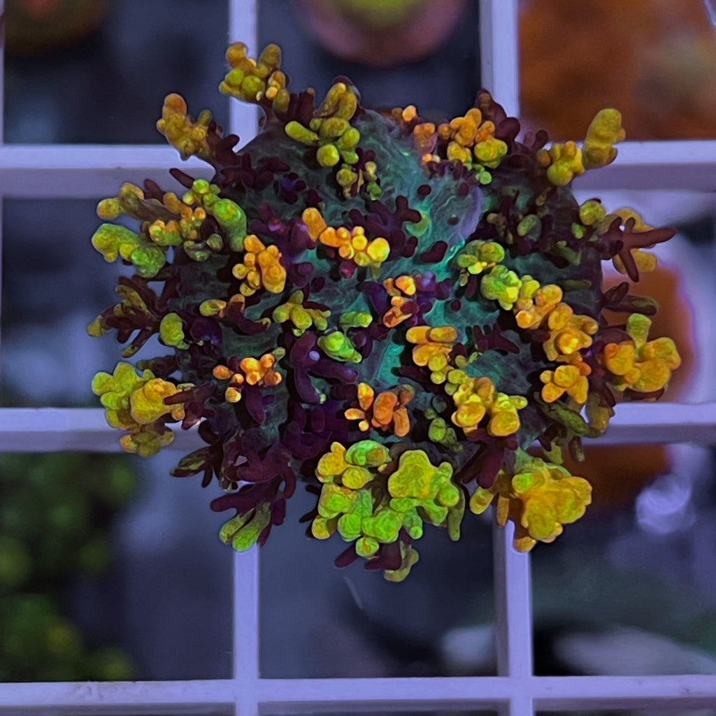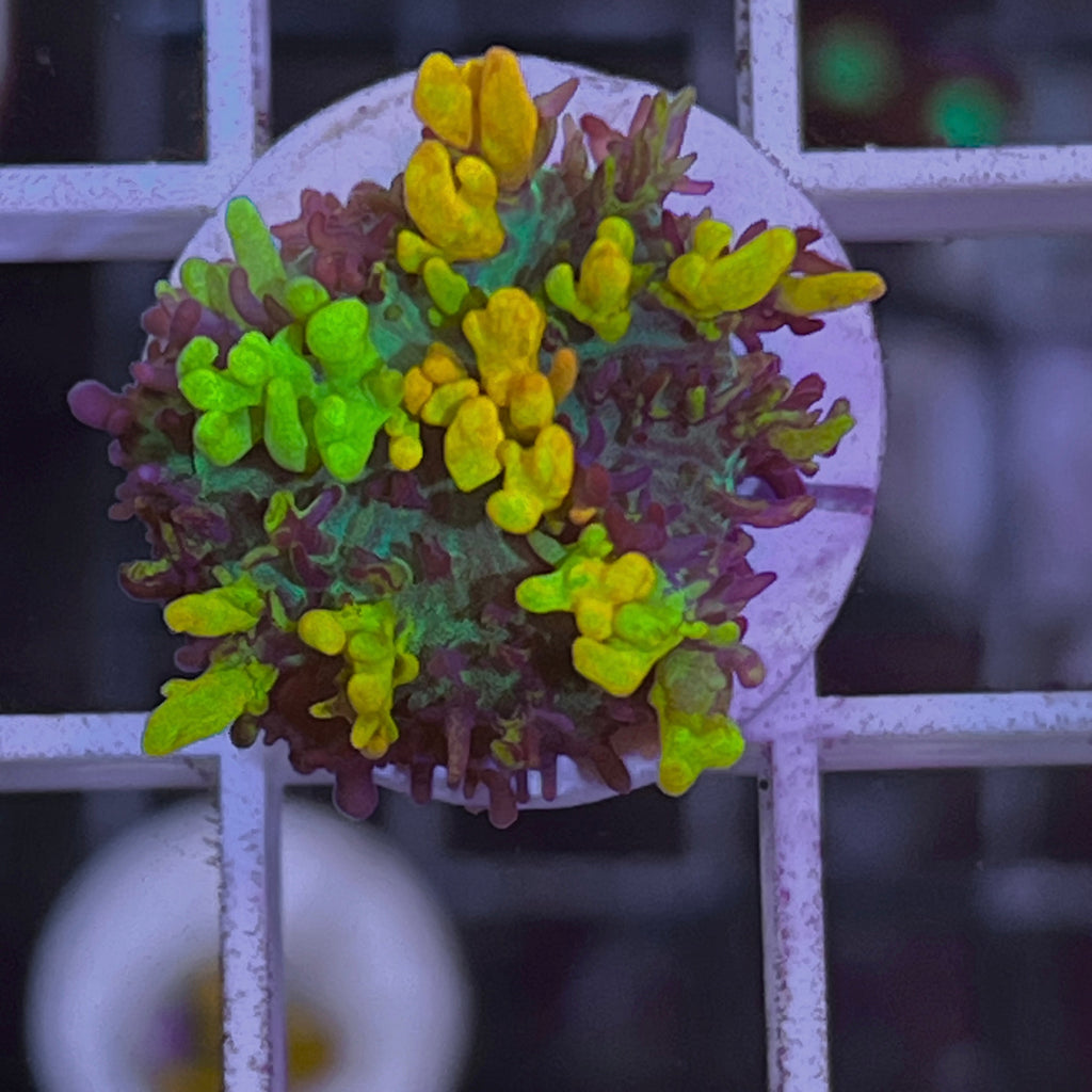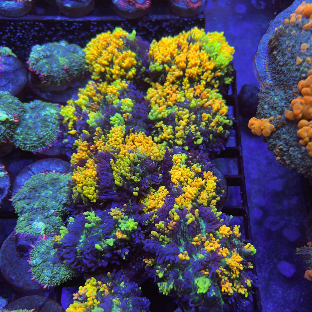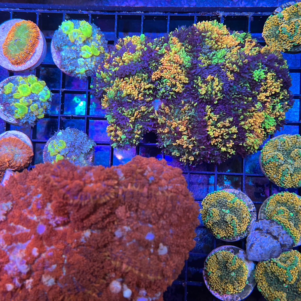 The CC Magic Carpet Mushroom is the most beautiful of all mushroom corals in my opinion. It’s that contrast of yellow green orange and purple coupled with the X-Large size they can get. It’s not uncommon for them to grow 4” across. Not only are they beautiful but they are hardy. I probrably had them for 8 years producing 100’s and never had one die. Can’t say that about to many corals. Also the lighting doesn’t seem to matter. I have had them in all lighting intensities and they always look the same.