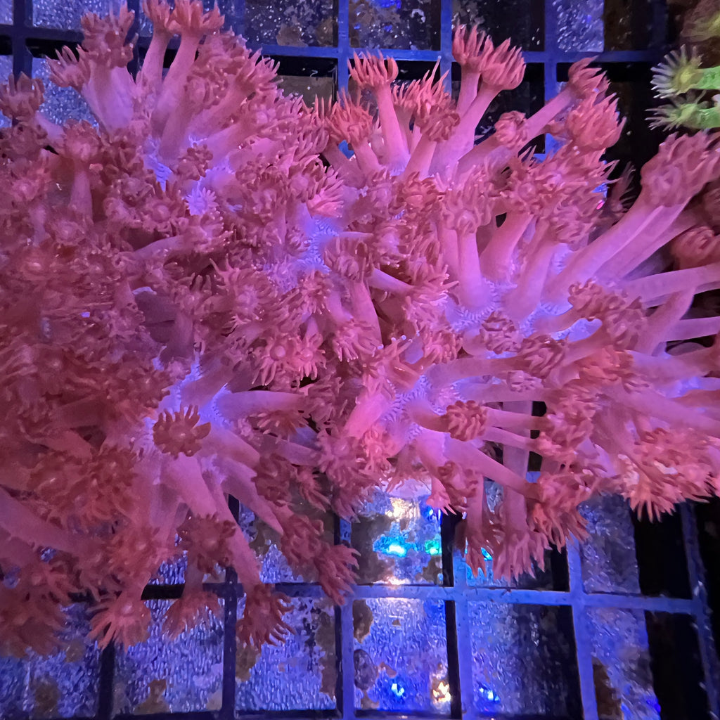 The Maroon 5 Gonipora is a proven tank raised Gonipora of over 10 years in captivity. It is usually deep maroon color but can be more pink in lower nutrient environments. It is a long tentacle Goni and will grow rapidly in a low to high light with medium to high flow. It does not require any special feedings and will derive all of its nutrition through photosynthesis.