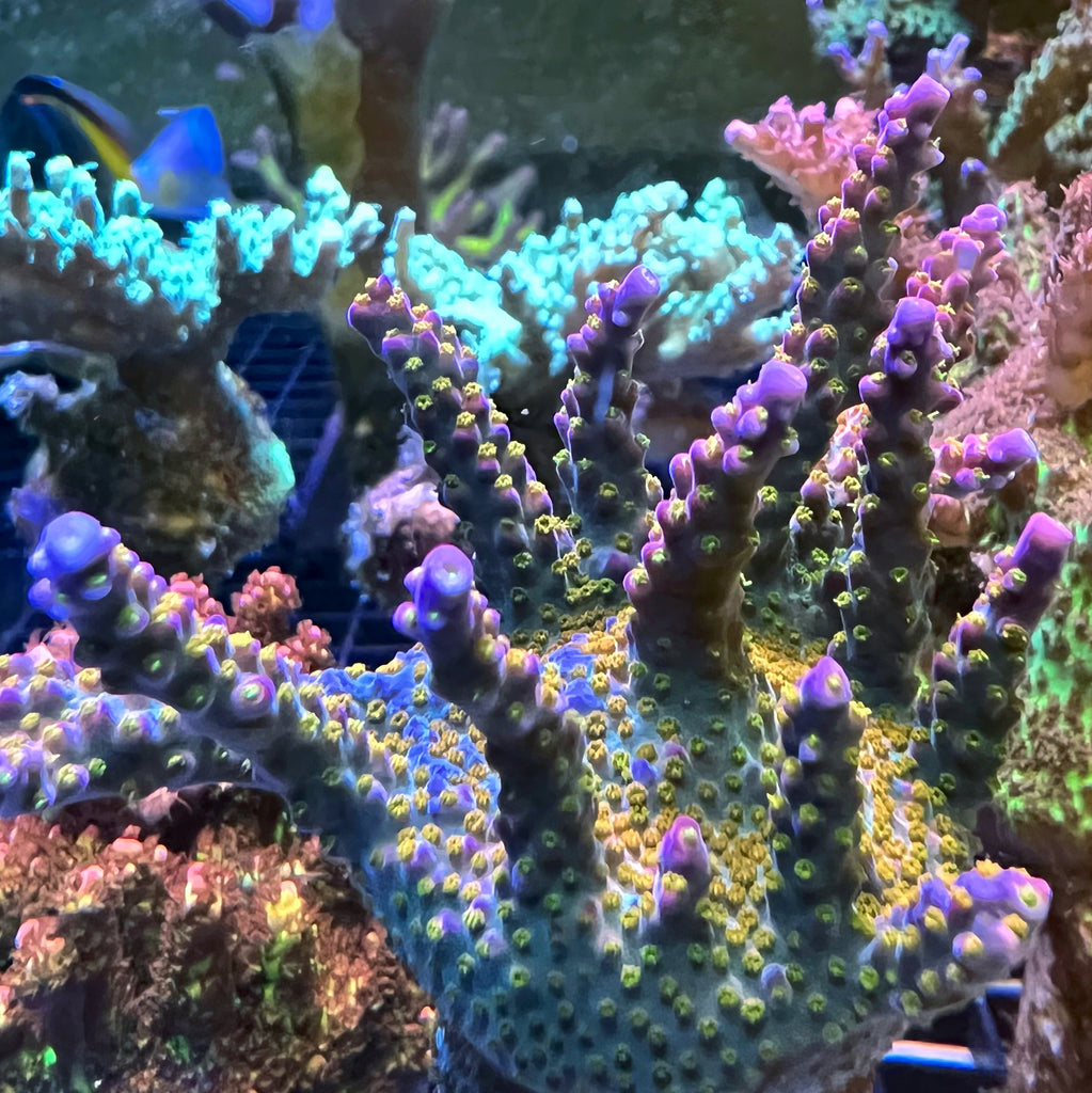 Tyree Merlin Staff Acro an unmistakable coral with its unique structure. It gives brown a new look with its beautiful hues of navy, purple, yellows and green.