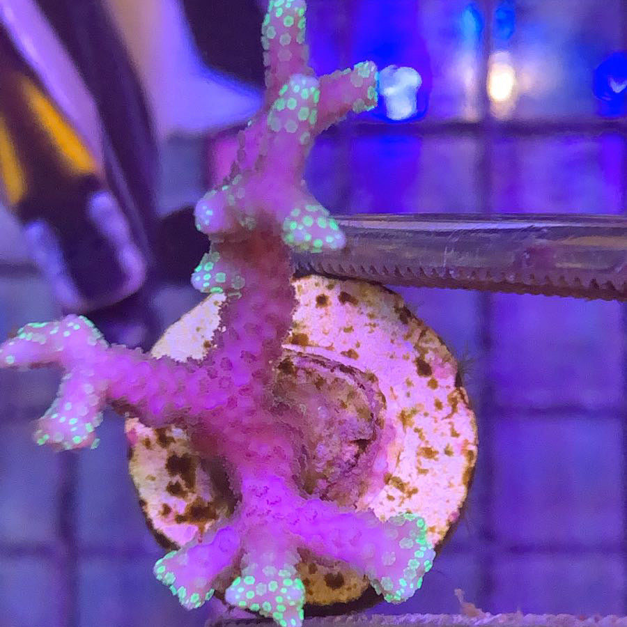 This exceptional variety of Pink Birdsnest coral has a tangled network of thin fuchsia branches with delicate green tips. The ORA Green Tip Pink Birdsnest has polyps that have a blueish green hue and widely spaced branches with rounded tips. Best placed in areas where water flow can reach throughout its structure as it grows. This coral displays the Pink best under lower kelvin lighting.